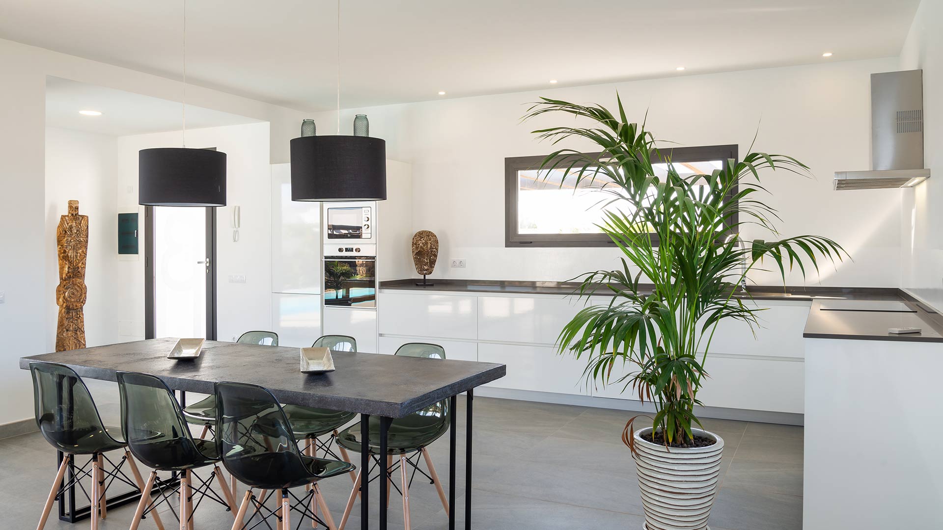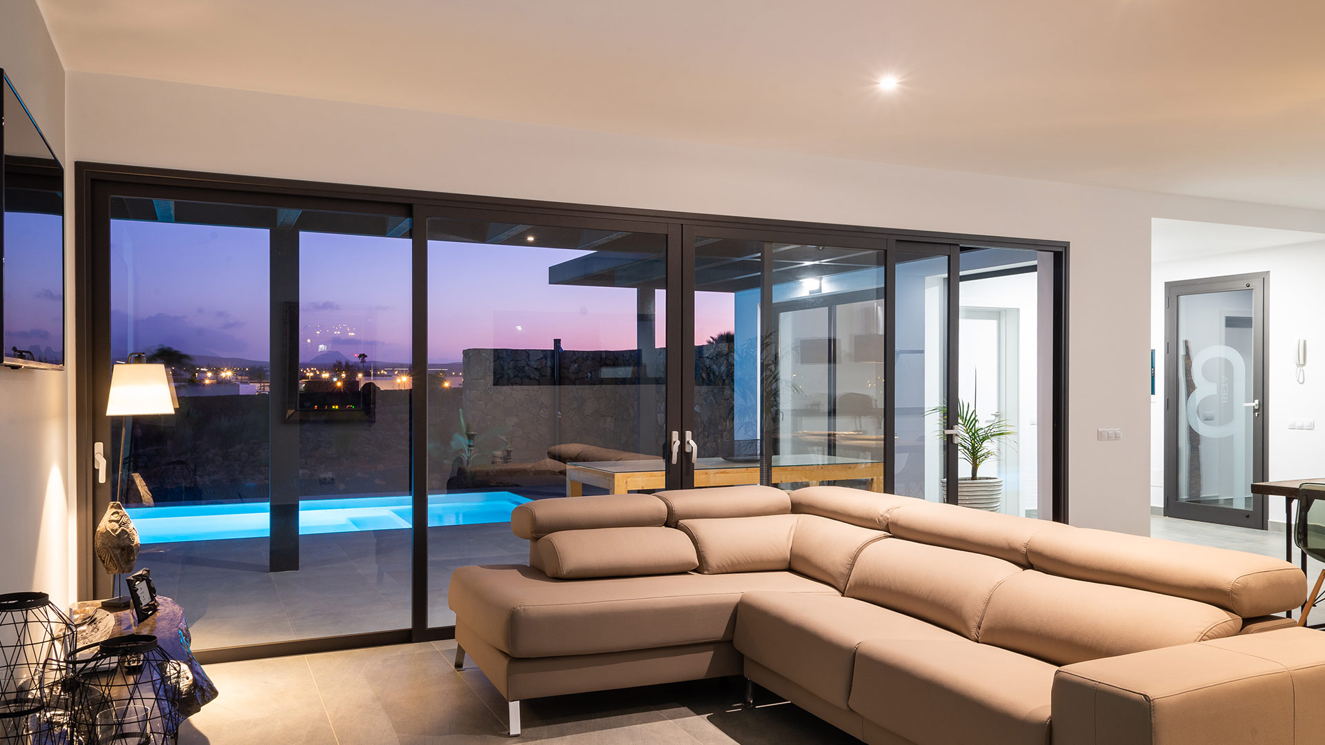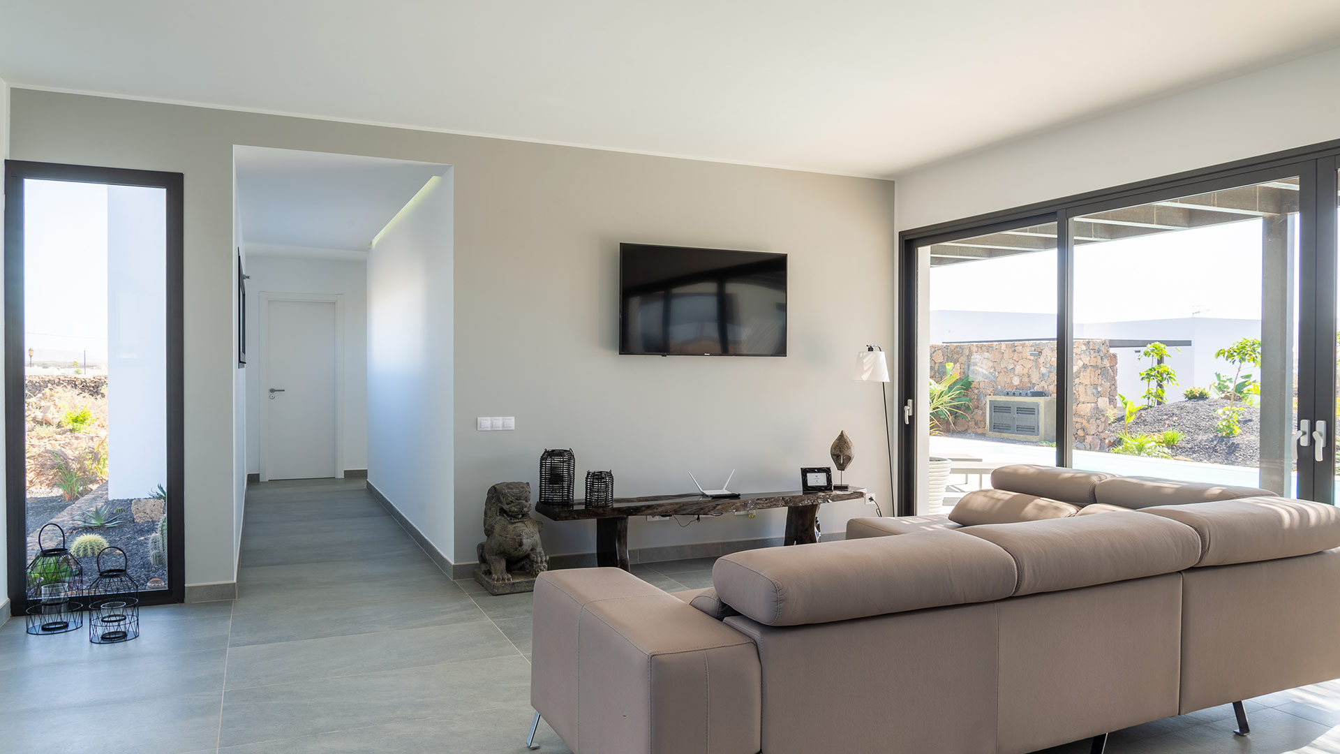 Minimalist design and large panoramic windows overlooking the Lajares volcano.